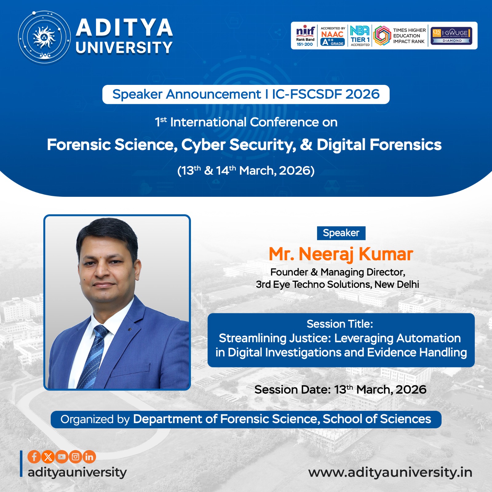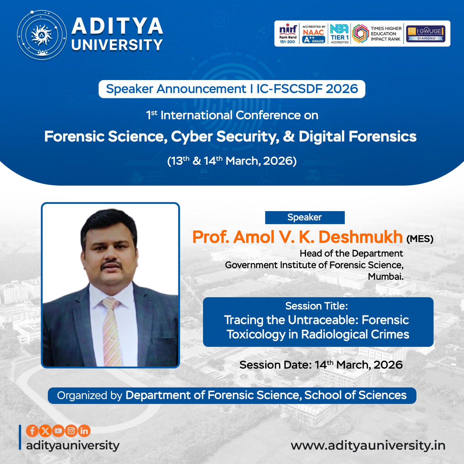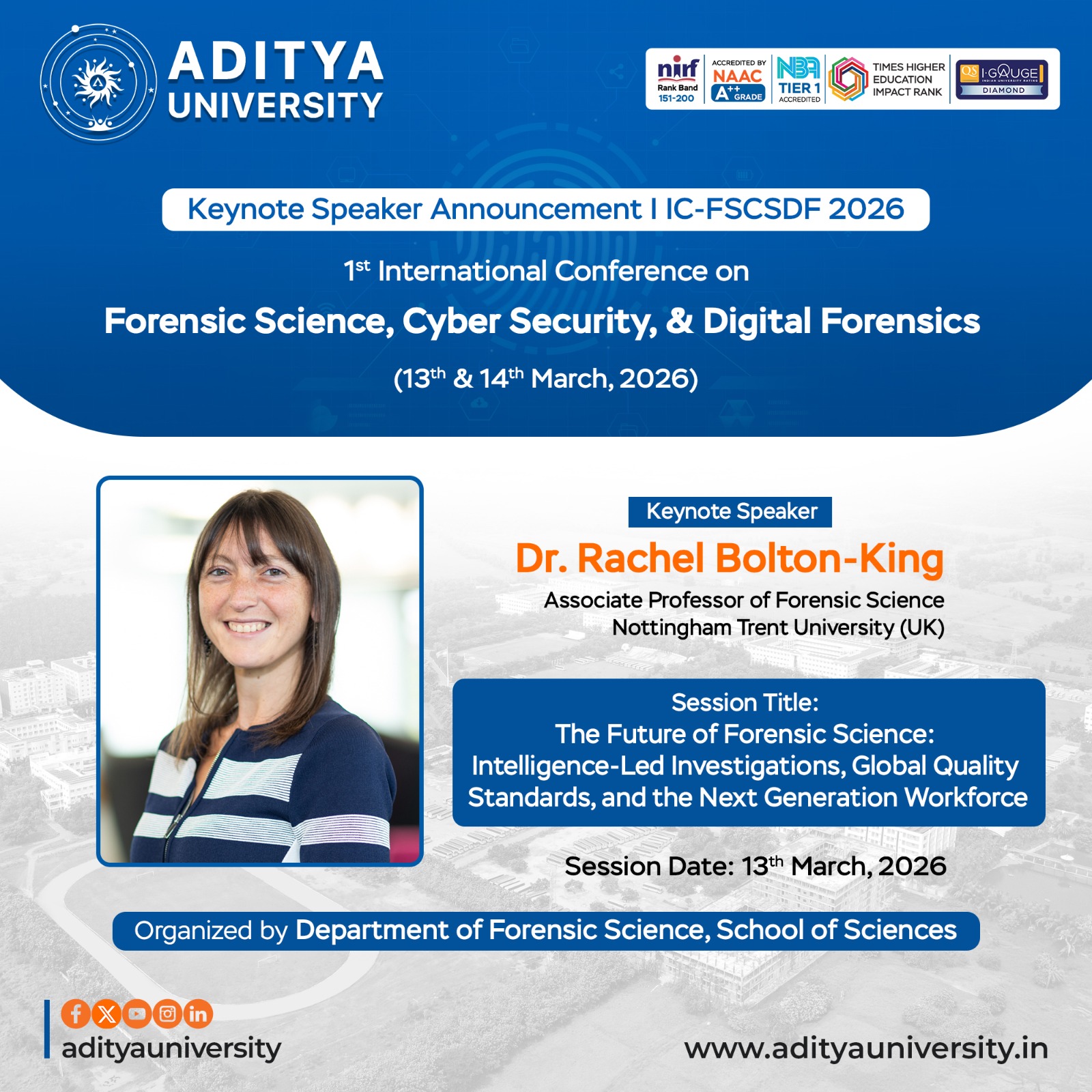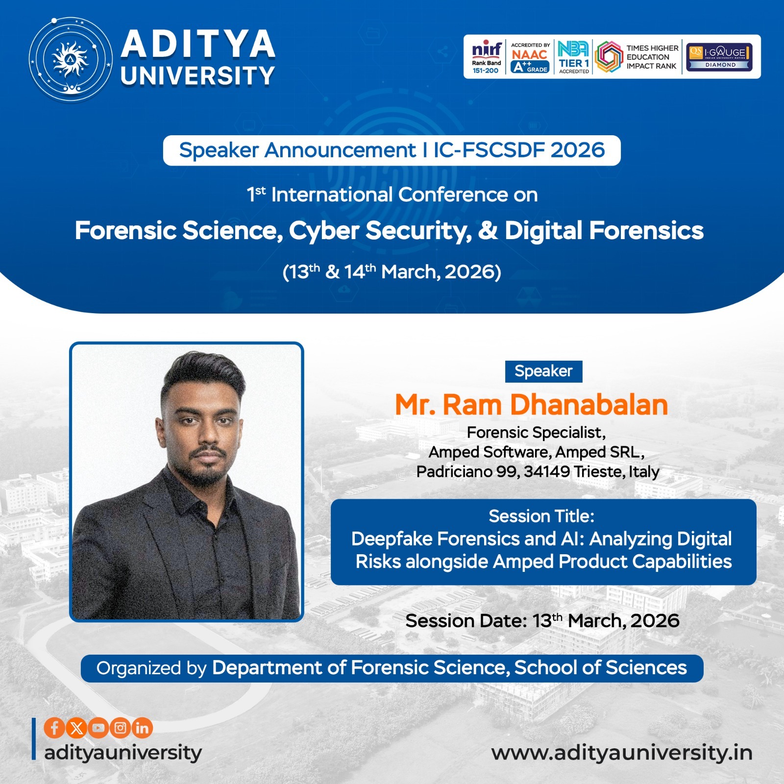 The 1st International Conference on Forensic Science, Cyber Security, and Digital Forensics (IC-FSCSDF 2026) is organized by the Department of Forensic Science, School of Sciences, Aditya University, Surampalem, and will be held on March 13th & 14th, 2026, in Hybrid Mode in Collaboration with SIFS India Forensic Lab, New Delhi, 3rd Eye Techno Solutions Pvt. Ltd., New Delhi, and Selective and Scientific Books, New Delhi. The conference aims to bring together leading researchers, scientists, academicians, cyber professionals, forensic experts, and students from around the world to share their innovative research outcomes and advancements in forensic analysis, cybersecurity solutions, and digital investigation technologies. This conference provides a global platform to exchange knowledge, discuss the latest trends in forensic science and cyberspace, and explore emerging tools and methodologies used in crime detection and cyber threat mitigation. The event will feature keynote talks, technical sessions, poster presentations, and industry collaborations that promote scientific excellence and high-impact research